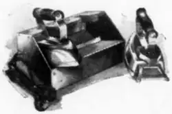 for a gasoline tank. This proved a puzzler for a moment, but since the engine was air-cooled and had no use for the ordinary type of radiator, this unit was converted into the gasoline tank. The famous wedding taxicab that empties its load at an unexpected moment, is a real cab, the body literally sawed in two and hinged so that it tips back. It is kept from falling off entirely by means of chains and is held upright by buckle supports which can be unfastened from the inside.