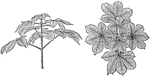 angles to the axis of the branch instead of being parallel to it, have long petioles, and palmate instead of pinnate veins. In this group the mode of growth is somewhat stiff; the main shoots are perpendicular, and the lateral ones nearly at right angles to them. The buds, also, are comparatively few, and the internodes, consequently, at greater distances apart, sometimes as much as a foot, though the two or three at the end of a branch are often quite short. The general habit is shown in Figs. 9 and 10. Now, if we were to imagine six beech or