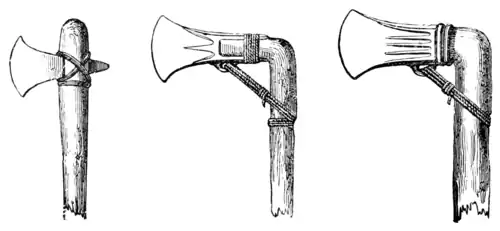 Figs. 7, 8, 9.—The three principal types of celts, and the manner in which they are supposed to have been handled.