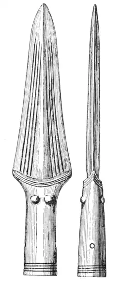| Fig. 20.—Bronze celt from Sweden. After Montelius. | Fig. 21.—Spearhead from Arreton Down. |