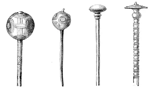 Figs. 51, 52, 53, 54.—Bronze hair-pins from the Swiss lakes, one-half of the actual size.