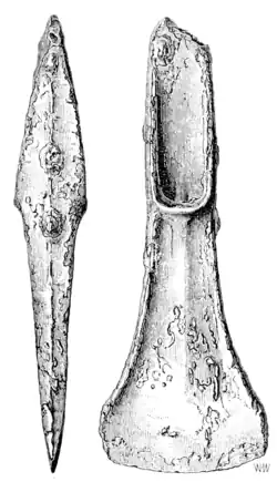 There is, I believe, only one case in which any bronze weapon or implement bears an inscription; a fact which is the more significant when we remember how often letters are met with on those of iron. Fig. 71 represents this interesting specimen, which is a winged celt, and is in the Museum Kircherianum of the Collegio Romano, at Rome. No explanation of the inscription has yet been given, nor do we even know to what alphabet the letters belong. It was found in the Campagna, but there is unfortunately no record of the circumstances under which it was discovered.