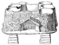 stand is supported by four columns represented as consisting of logs, lying one upon the other. The roofs are unfortunately wanting. The sides are ornamented with the double spiral so characteristic of the Bronze Age.
