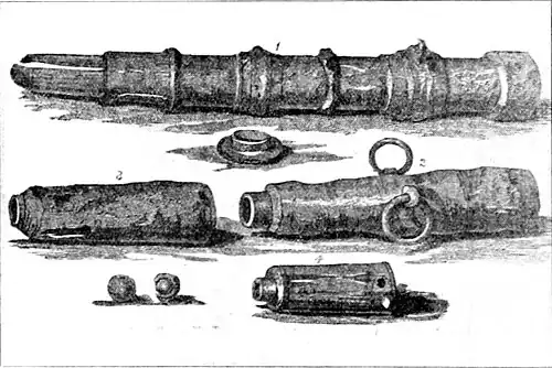 of gunpowder, wadded with oakum. Of numerous balls discovered, some were of granite of from 3½ to 6 inches in diameter; one was