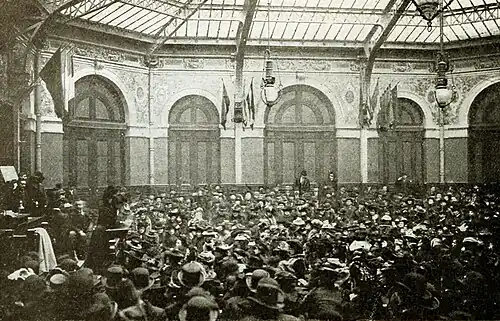 Interior of the great hall in the “Bourse du Travail” in Paris during the seamstresses’ strike.