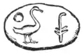 I groped about, and produced something hard, done up in a little linen bag. Out of the bag we took first a very beautiful miniature done upon ivory, and, secondly, a small chocolate-coloured composition scarabæus, marked thus:—