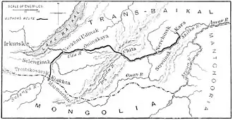 MAP OF ROUTE FROM TRÓITSKOSÁVSK TO KARÁ. was not released from his leg-fetters even when prostrated by typhus fever.