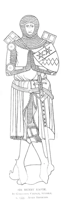 [Bacon, Sir Henry, of Gorleston, Sufl'olk, temp. E. III. (1335)—bore, gules a bend fusily sable, on a chief argent two spur-rowells of the second.] Add. MS. 19,116 fo. 129, See Momnnental Effigy.