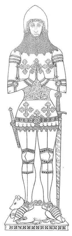 (3) Sir Edward (or Sir Giles) who was knighted at the capitulation of Calais 1348, differenced, with a label (5), pendants gobony argent and azure.