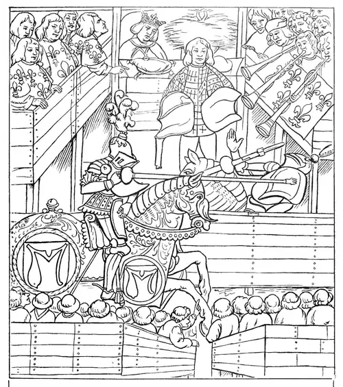 Richard, Erie of Beauchamp, justying at Gynes; he cast to the grounde at his spere poynt behynde the horse taile, the Knyght called the Chevaler Ruge C. 1410.