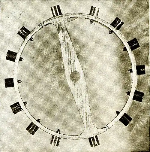 The vibrations of the balance-wheel are the result of the action of two forces, one being the force of the mainspring acting through the “train” of wheels and the escapement, to turn the balance-wheel on its axle, and the other being the opposing force of a very small spring, known as the hair-spring, coiled loosely about the balance-wheel, and which thus tends to regulate the power of the mainspring.