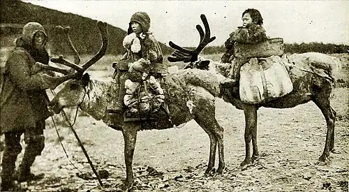 Riding a reindeer. to protect the fawns from the attacks of wolves and dogs. At the end of their apprenticeship, the herders have about fifty deer, which, with the