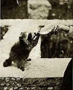 A young racoon taking milk from a bottle. Ernest Thompson Seton truly says, “The old racoon is sullen, dangerous, and untamable if kept captive, but the young, if taken at an early age—that is, before they have begun to hunt for themselves—make intelligent and interesting pets, being easily tamed and evincingconsiderable affection for their master.”