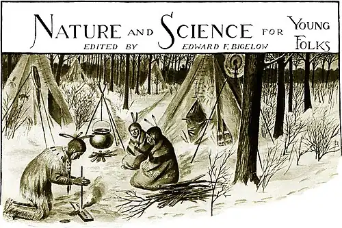 Our heading this month shows some Sioux Indians who have just settled in a camp; one is starting a fire to use under the big copper kettle near by. These copper kettles were obtained from the early traders, and nearly every tribe had one.