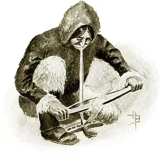 The northern Indians, or Eskimos, produced fire in much the same manner, except that they used a mouthpiece to hold the upper part of the stick. A little inset of bone was placed in the mouthpiece where the stick came in contact with it, to prevent wear, and also to keep the drill from making fire at both ends. The drill was revolved by a thong wound about it and attached to a short bow. This was a great improvement.