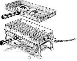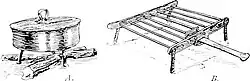 A. The early Dutch oven. B. General Washington’s camp gridiron, with sliding handle for convenient packing. |