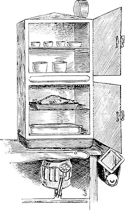 its appearance. It does not cook without fire, but it does retain the cooking heat. Many models are now obtainable, some in box form with several deep cooking compartments. The accompanying illustration shows one of the round forms. The cast-iron (black) plates seen, one above and another below the cooking vessels, are first heated. When very hot, one or both may be used and radiate their heat in the apparatus. In this cooker, instead of several pads and a tight-