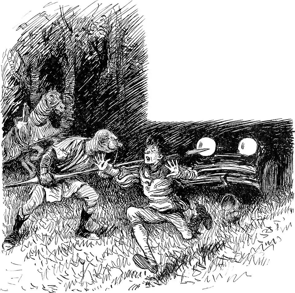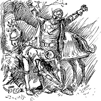 Not long had this snore been outbooming, before An answering challenge came sounding; He sprang to his feet, as with oncoming roar, A creature with blazing eyes down on him bore, With terrible leaping and bounding! No nightmare that ever climbed up on your bed Could mate with this fearsome creation: Of iron and brass was its big, bulgy head, Its body was colored a fiery red, Its feet pranced in rapid rotation. (Prepare now your last mortal moans, Bold Sir Christopher Jenkinson Jones.)