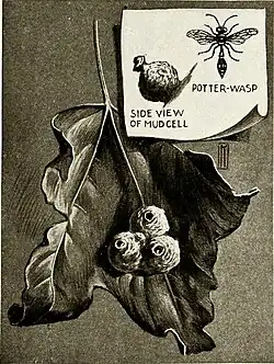 THE CURIOUS NESTS OF THE POTTER-WASP. continues for about two weeks, when the grub, now grown to a good size, spins a cocoon, and in this state remains for perhaps a few weeks, after which it changes to a full-fledged wasp, and, being no longer content in its confined quarters, it deliberately pushes out the little clay plug that has closed the jug, and goes into the world to take up its work in the great realm of nature. And the little jugs are left deserted and empty.