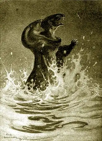 “‘WHEN THE FIGHTERS REACHED THE SURFACE, LASHING AND SPLASHING.’” slim, black form was plainly visible as it arose through the graying water. As he popped his nose above the surface, he found himself confronted by two sturdy heads, which snarled in his face and snapped at him fearlessly. He was surprised and pained. He had expected to find those two youngsters half frightened to death, and surely not half so big. In fact, here at home and guarding their own threshold, they looked to him twice as big as they really were. He discreet'y withdrew. This sudden diffidence was fortunate for the two Little Furry Ones. For the mink, let me tell you, would have been a tough proposition for them to tackle.