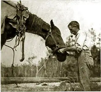As he led the first horse to the old corduroy bridge, I turned my camera upon it. It took some time to satisfy the two horses, but the improvised pail proved entirely satisfactory. D. Lange.