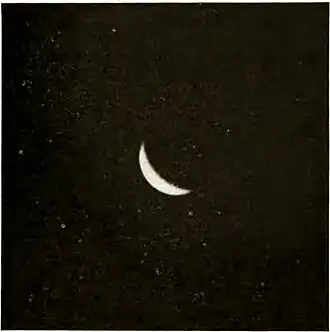 The planet Venus passes through all the phases that the moon does, and for the same reason. It does not give out any light of its own, but shines entirely by reflecting the light of the sun. Its path around the sun lies between the earth and the sun. When beyond the sun, as seen from the earth, its fully illuminated side is turned toward us, and it appears round, like the full moon. When it is this side the sun and coming in between us and the sun, we see only part of the side that the sun is shining on, and it no longer appears round. As it comes in more between us and the sun, it assumes the crescent phase, becoming a thinner crescent, until it is a mere thread of light, and is lost in the superior brightness of the sun. Under very rare conditions, at extremely long intervals, it passes across the sun's disk as a round, black spot, or makes a “