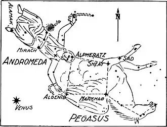 The stars near it form the square of Pegasus, which you will see standing up on one corner, with one side nearly pointing at Venus. Pegasus is the winged horse, the square is its body, and the triangle of stars forms its head.