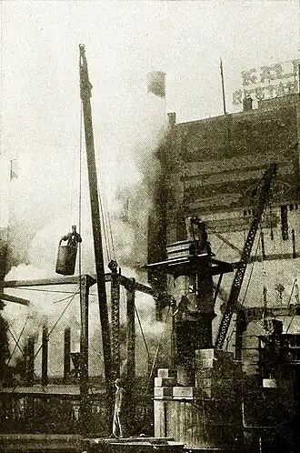 AT WORK ON THE FOUNDATIONS OF A SKY-SCRAPER. IN THE FOREGROUND IS A NARROW WOODEN CAISSON.
