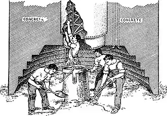 When, at last, we reached the bottom of the shafting, we wriggled down a rope ladder to the ground. The working chamber was rectangular, measuring about ten by fifteen feet; five sand-hogs were at work. They had dug a wide hole in the sand at the center of the chamber, and were extending it toward the sides. Mr. Squires explained that they would dig to the edge of the chamber, undermining the edges of the caisson if necessary, so that they would sink into the ground. The deck, a foot or so above our heads, was made of heavy timbers, and supported a concrete pier that extended in a solid mass eighty feet above us. The shaft was getting so deep that the weight of the concrete was no longer enough to force it down, and tons of pig-iron were loaded on top to overcome the friction of the earth on all sides of the caisson.