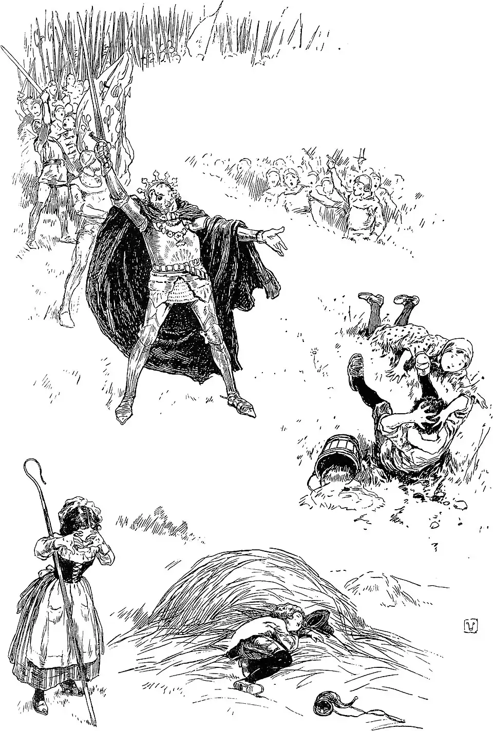 The King of France was close at hand, a-marching up the hill, But kindly turned his men about to search for Jack and Jill;And Jack and Jill, with all good-will, they hunted up Bo Peep. And then they wakened poor Boy Blue, beside the hay asleep.
