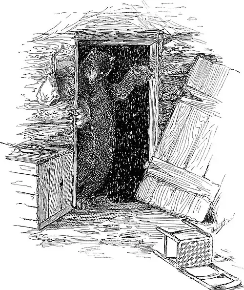 Turning to the door in a bewildered fashion, he saw on the soft earth outside the tracks of his assailant. They were big, broad tracks—the tracks of a grizzly bear. The smell of ham had made the bear a burglar!