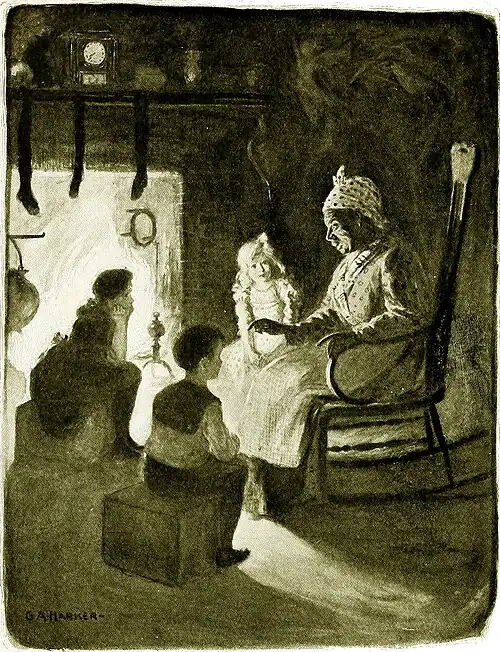 Of all the pleasant places, oh, the best, I do believe,Was old Jemima’s kitchen one snowy Christmas eve,When Ted and Eleanor and I drew up her big arm-chair,And we, on kitchen-boxes, sat in a circle there!And Aunt Jemima said: “Lan’ sakes! You chillun beah ag’in?Well, I reckon I must tell you about Br‘er Tarra-pin,How he frazzled po’ ole Mistah Fox and fooled Br‘er Buzzard, too,And played a mighty low-down trick on Mistah Kangaroo.”The wind howled down the chimney, but the fire it snapped and glowedAs Jemima told us, also, of Br‘er Rabbit and Br‘er Toad,And that other funny story of Br‘er Turtle and Br‘er Coon,And showed us li‘l Br‘er Rabbit‘s house, away up in the moon.And then she said: “Now, chillin, run—’fo’ Santa comes along!”And leaned back in her squeaky chair and sang a Christmas song.Carolyn S. Bailey.