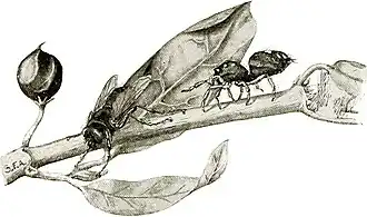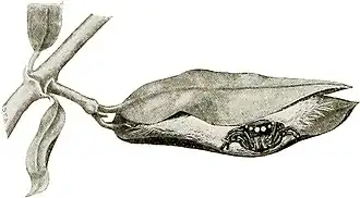 A little jumping-spider, with nest in honey suckle-vine, sneaking on a fly. In this case the fly flew as the spider jumped, and it is doubtful if the little Attus could have held the Musca even if the latter had been fairly caught. Smaller flies, tree-hoppers, larvæ of small moths, gnats, midges, and the like are the common prey of this spider. Sometimes ie attacks insects larger than itself, but is seldom successful with big active flies.