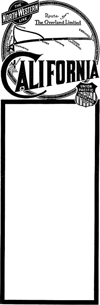 ![]() Every day in the year, the famous Overland Limited leaves Chicago for the Pacific Coast. It is the most luxurious train in the world and traverses the most direct route across the continent. Electric-lighted throughout, it makes the journey solid through without change, less than three days en route, over the only double-track railway between Chicago and the Missouri River. All appliances for safety, comfort and speed that a liberal expenditure of money and skill can secure.