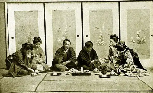 If it’s your first Japanese dinner you ’re having a dreadfully hard time. In the first place, you must sit on the door, for they don’t have any chairs in Japan. You kneel down, and when you turn your toes in till one laps over the other, and then you sit back between your heels, At first you are quite proud to find how well you do it, and you don’t think it ’s so very uncomfortable. But pretty soon you get cramped, and your legs ache as if you had a toothache in them. You don’t say anything, because you think that if the Japanese can sit this way all day long, you ought to be able to stand it a few minutes, Finally both your feet go to sleep, and then you can’t bear it a moment longer, and you have to get up and stamp round the room to drive the prickles out of your feet, and all the little dancing-girls giggle at you. This is n’t your only trouble, either. All you have to eat with is a pair of chop-sticks, and you ’re in terror lest you spill something on the dainty while matting floor.