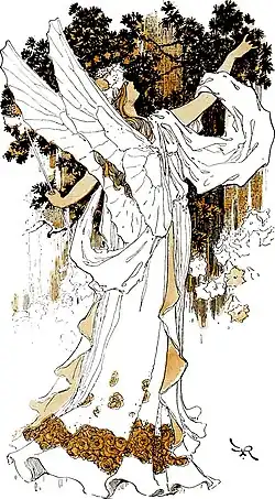 At a sign from the queen they one and all approached the golden loom and fastened an end of thread in its warp. Next moment they were gleefully dancing hither and thither, while the silver shuttles flew swiftly from hand to hand and the gossamer-like web began to grow upon the loom.