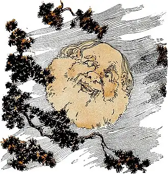 “‘Give it to the first unhappy person you meet’, said the man in the moon.” (see page 6.)Long and swiftly the fairy band worked beneath the old moon’s rays, while their feet tripped gracefully over the grass and their joyous laughter tinkled like silver bells and awoke the echoes of the grim forest surrounding them. And at last they paused and threw themselves upon the green with little sighs of content. For the shuttles and loom had vanished the work was complete and Queen Lulea stood upon the mound holding in her hand the magic cloak.
