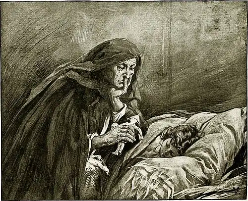 “Just before leaving, kind old Frau Metzger went into the room where Mary Ellen was sleeping.” (See page 262.)