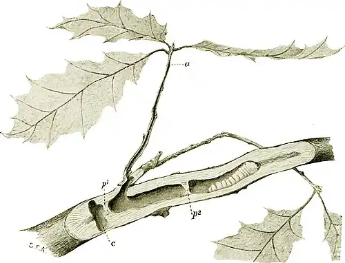 Fig. 2. Red-oak branch and twig, cut open to show the burrow of the oak-pruner larva. a, where the egg was deposited; c, where the branch was cut nearly off; p1, first powder-post plug; p2 second plug