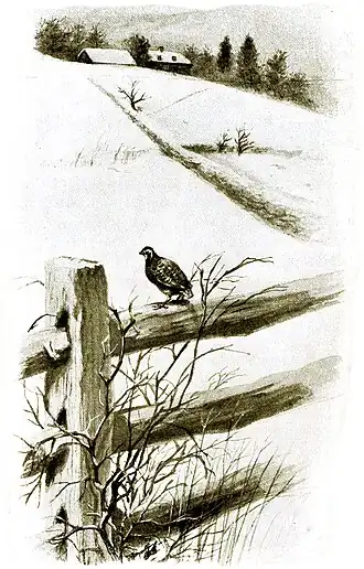 A Quail “At Home,” Down Under the Hill Back of the Farm-house.the rear of the barn, fork in hand, looking out over the fields. Snow-storm had followed snow-storm, until the stone walls were so covered that the farm seemed like a great field, with here and there a small grove to break the monotony. The cattle had been fed, and each animal was munching contentedly at its pile of hay in the sunshine, scattering chaff over the snowy barnyard.