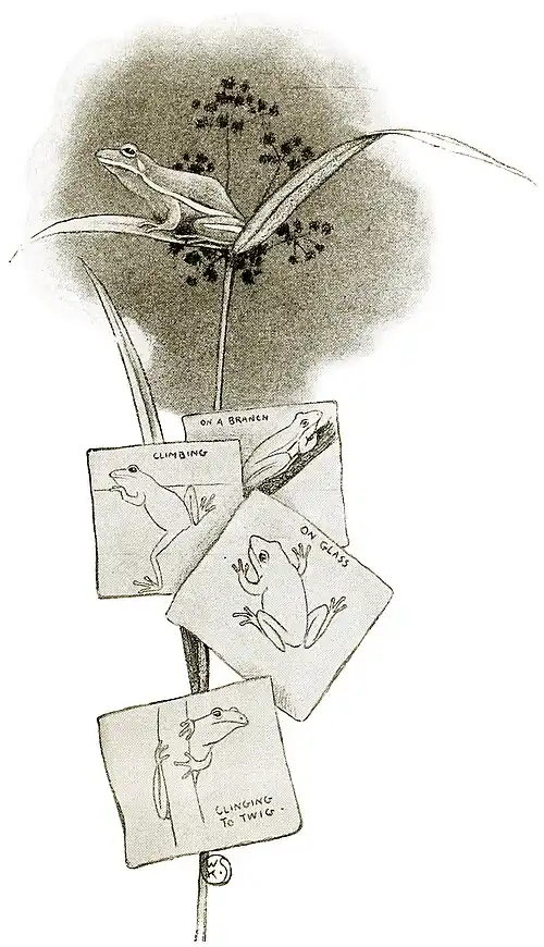 At once she suspected that this was no common frog, as they cannot crawl up glass, and she thought it was a little Northern tree-frog. What was her surprise, therefore, to find, upon noticing it more carefully, that it was a beautiful pea-green frog, with slender legs, beautiful gold-veined eyes, and golden-light stripes down each side and along the outer seam of his “coat sleeves” and “trouser legs.”