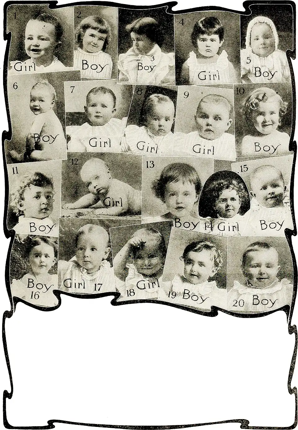 The above portraits were shown in our exhibit at the St. Louis Exposition. We offered $250.00 in gold to the person who could correctly guess the boys and girls in the 20 numbered pictures.