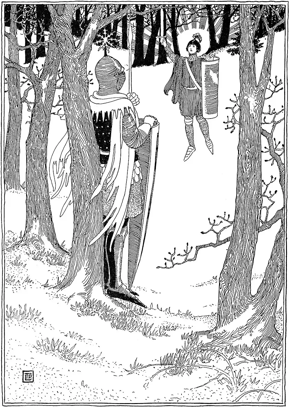 Away in the forest there stands a good knight Clad all in a coat of mail;His lance is made of an icicle bright, His arrows are the hail. And now and again he encounters a knight In Lincoln green arrayed;His crest is a spray of hawthorn white, A sunbeam is his blade. |