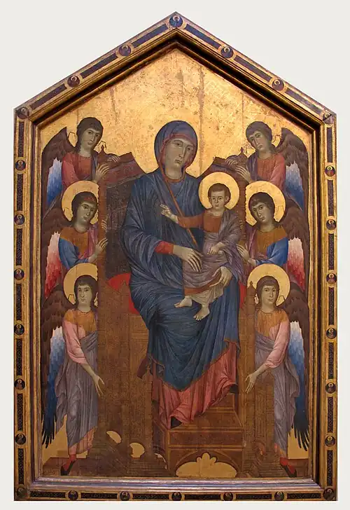 ment of the forms. The throne actually has length, breadth, and thickness; so have all the figures, and they rest firmly upon the ground; the artist has called in the aid of perspective to enforce the reality of his group. Now how has he accomplished this appearance of reality? By the use of light and shade, and by making his lines express the structure and character of the object. Compare, again, for example, the figure of the infant Saviour in the two pictures. In Cimabue’s the drapery is scored with lines which vaguely hint at folds