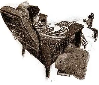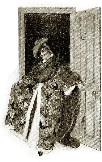I left my medicine in my room, and picked up my red tam-o’-shanter and put it on so that it drooped effectively over on one ear. My flowing robe was of royal red, I tossed one corner of it over my shoulder in a stagey and princely manner, There was n’t a soul in the corridor. I stood myself in front of the door of 320, and knocked in a loud and cheerful tone—though I was shaking in my slippers all the time. There was a small-sized “Come,” and I flung open the door, and scraped the floor with as majestic and sweeping a bow as I could muster,