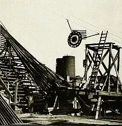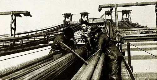 ![]() STRINGING THE LAST PAIR OP WIRES ON A CARRIER BEARING TIE STARS AND STRIPES. |