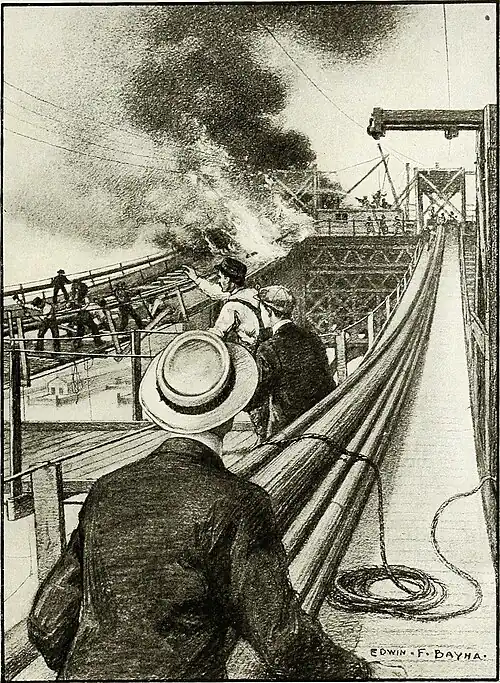 base of the tower were helpless. Some of the firemen tried to drag the hose up the long stairways to the top of the tower, but when they finally did reach the top, and gave the signal for the water to be turned on, the hose burst, and all their labor went for naught. A second hose line was made of better stuff, but only a weak, sickly stream trickled out of the nozle, because the engines were scarcely powerful enough to pump water so high, even when a number of them were coupled up in tandem. A few of the firemen had hand-extinguishers with them, which held the blaze in check for several minutes; but that ammunition gave out soon, and it was evident that we would have to abandon everything and run.