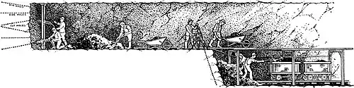 been blasted out, it is not so difficult to split out the rest of the heading. At each side of the “cut” a row of “relief,” or side, holes is drilled, and finally a set of “liners,” or rim holes, that slant outward to some extent, so that the rock will be shattered to the full diameter of the tunnel. After the holes are drilled, the cut is blasted out first, then the “relief” holes, and, finally, the “liners.”