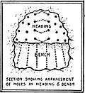 to hasten the borings and enable two drill gangs to work at the same time, It is comparatively easy to blast away the “bench,” because the “shot” holes are drilled downward from the flat, upper surface, and when the dynamite is set off, it splits away the rock in slabs; but in the case of the “heading,” a special arrangement of “shot” holes is necessary, because the rock can be attacked only from the face. The first thing to be done is to remove a wedge, or “cut,” from the center of the “heading”; two rows of holes are driven in at an angle so that they will meet, or nearly meet, at a depth of about eight feet back from the face of the rock, Alter this wedge has