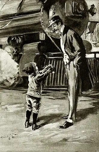 Together they ate the lunch which had been left on the pantry shelves for them, Will’m helped set it out on the table. Then he went back into the shop with Miss Sally, But his endless questions “got on her nerves” after a while, she said, and she suddenly ceased to be the good company that she had been all morning. She mended the fire in the sitting-room and told Will’m he ’d better play in there till Libby came home. It was an endless afternoon, so long that, after he had done everything that he could think of to pass the time, he decided he ’d write his own letter and send it up the chimney himself. He could n’t possibly wait for Libby to come home and do it. He ’d write a picture letter. It was easier to read pictures than print, anyhow. At least for him, He slipped back into the shop long enough to get paper and a pencil from the old secretary in the corner, and then, lying on his stomach on the hearth-rug with his heels in the air, he began drawing his favorite sketch, a train of cars.